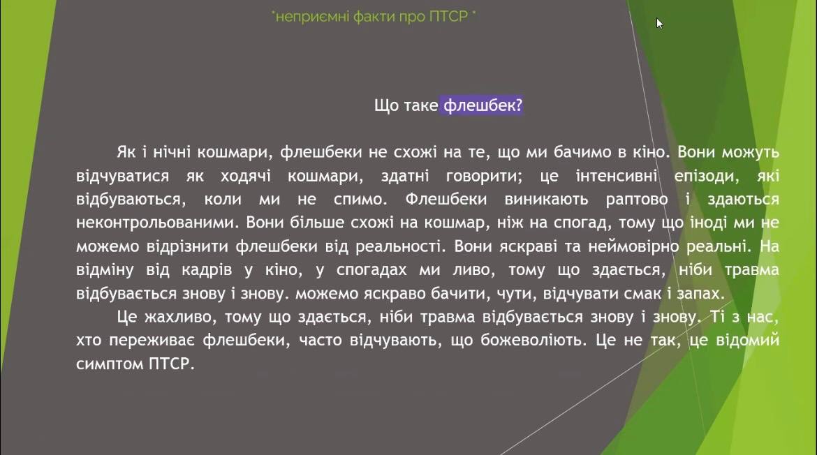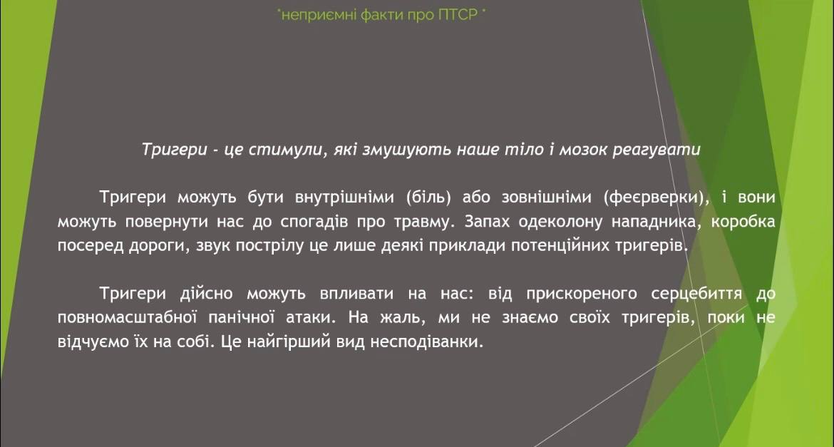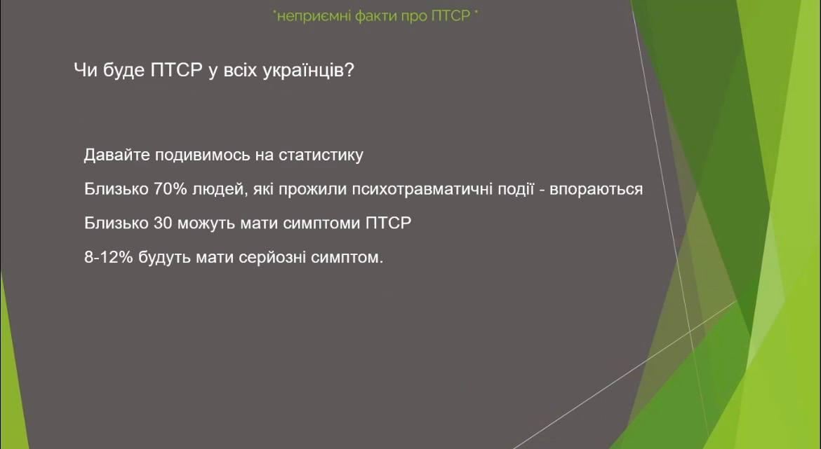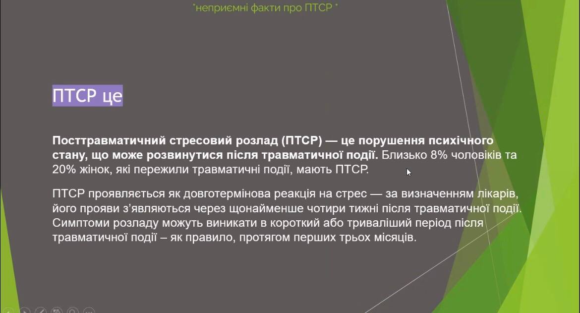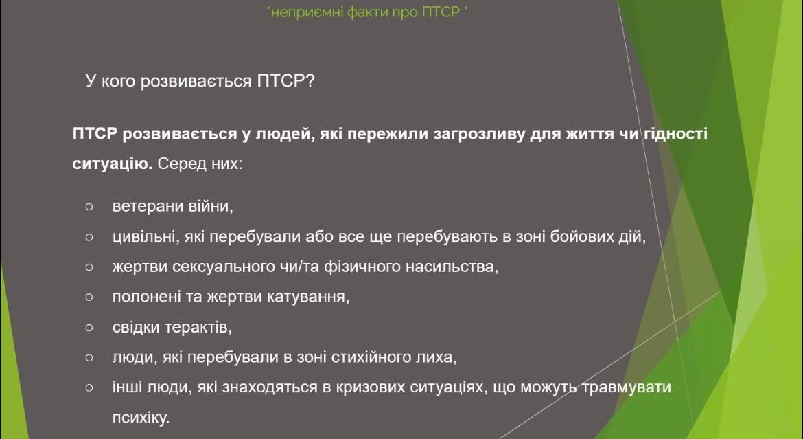 Окрема увага була приділена питанню посттравматичного стресового розладу. Було зазначено, що ПТСР — це природна реакція організму на пережитий стрес і бойові травми. Він може проявлятися у формі нав’язливих спогадів, підвищеної тривожності, емоційної відчуженості чи раптових спалахів агресії. Водночас ПТСР — це не «слабкість» людини, а стан, який вимагає розуміння, підтримки та правильного підходу у спілкуванні.